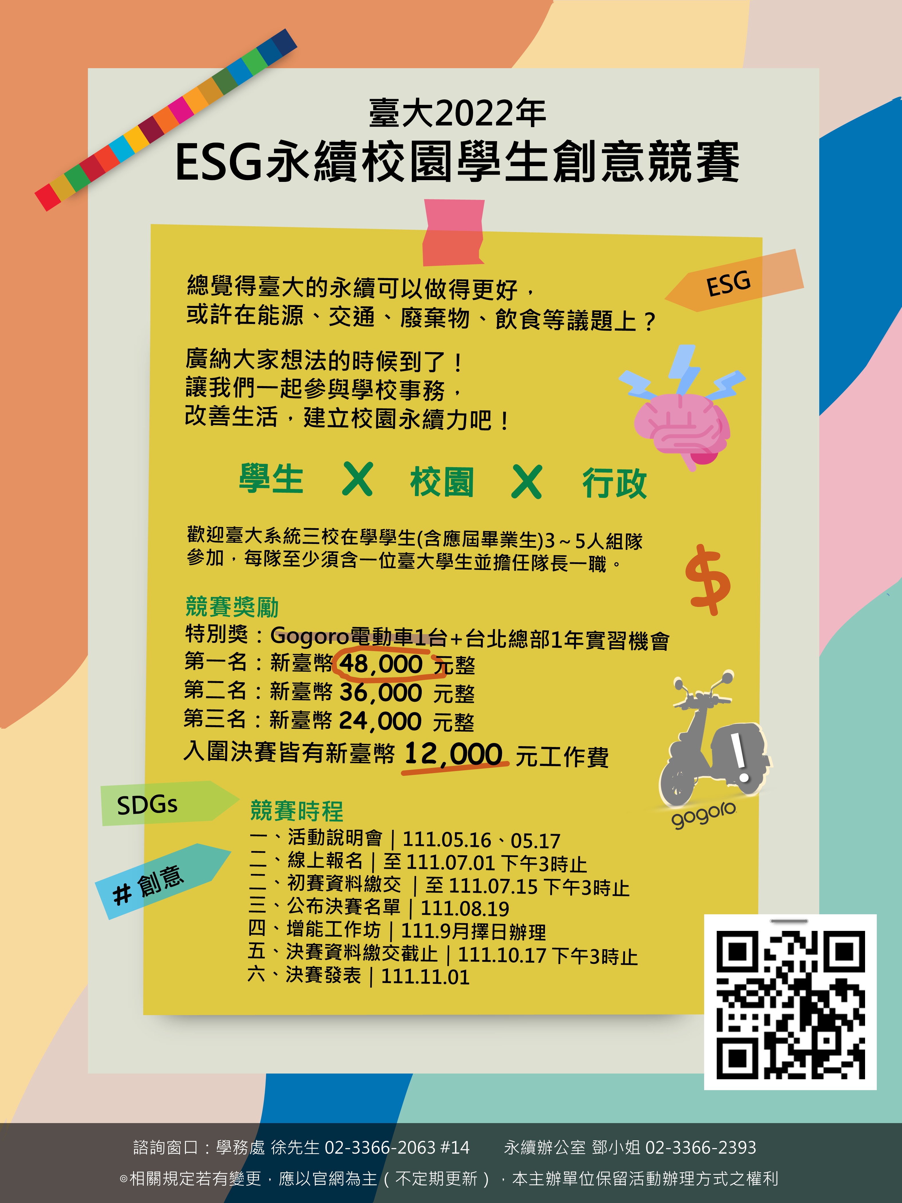 為建立校園永續力,廣納學生創意發想改善生活,共創更好的臺大永續校園,學務處與永續辦公室特辦理此次ESG永續校園學生創意競賽。 邀請國立臺灣大學系統在校學生發想與校園永續治理相關之提案及執行策略,攜手營造臺大人的永續未來。