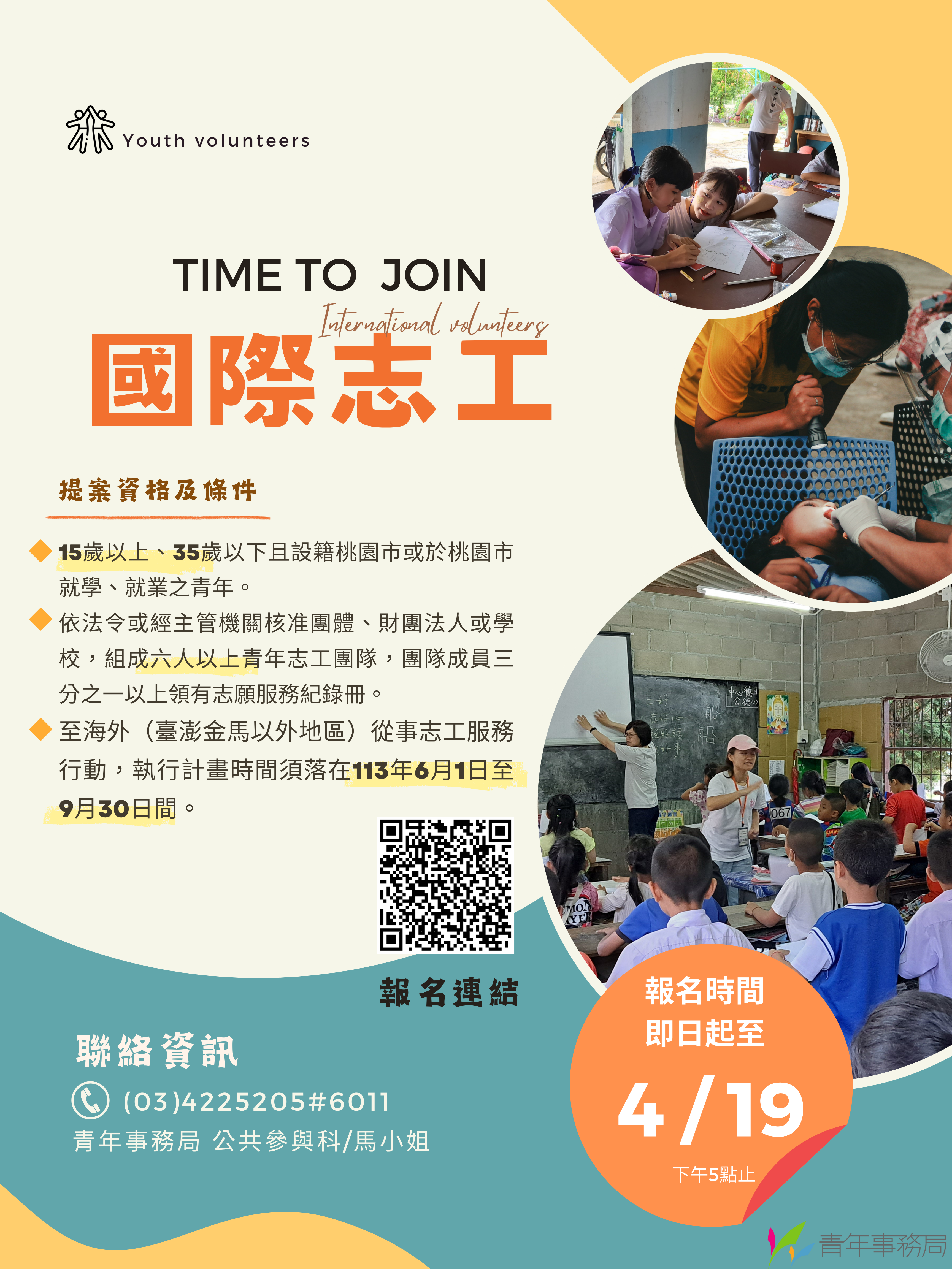 依據:桃園市政府促進青年社會參與補助作業要點(以下稱本要點)。 提案對象及資格 本計畫所稱之青年,係指15歲以上、35歲以下且設籍本市或於本市就學、就業之青年。 依法令或經主管機關核准團體、財團法人或學校,組成六人以上青年志工團隊,團隊成員三分之一以上領有志願服務紀錄冊。 至海外(臺澎金馬以外地區)從事志工服務行動,執行計畫時間須落在113年6月1日至9月30日間。 提案範圍及內容