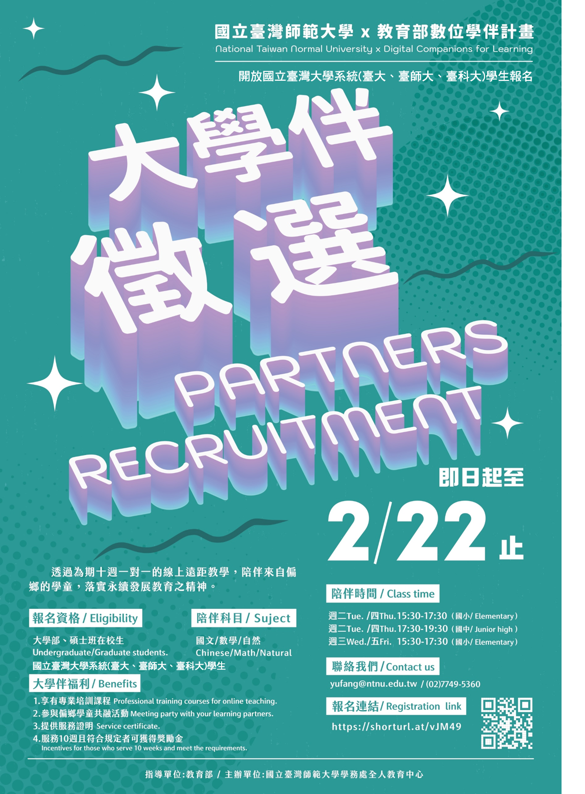 Project Spirit and Introduction Utilizing online media to overcome urban-rural spatial barriers, based on companionship and learning, to train university students in using information tools and resources in teaching. Through online real-time companionship and learning, it assists in enhancing the learning motivation and interest of students in remote areas, promoting equal learning opportunities between urban and rural areas. National Taiwan Normal University has been implementing the Ministry of Education's "Digital Learning Partner Program" since the year 107, aligning with the United Nations Sustainable Development Goals (SDGs) to implement the spirit of sustainable development education. Through this program, it aims to enhance the quality of education in remote areas, broaden the learning horizons of rural students, and fulfill the university's social responsibility and practice social justice!